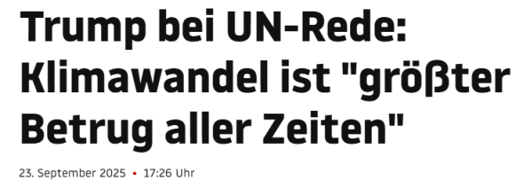 In seiner Rede vor der UN am 23.09.2025 bezeichnete er den Klimawandel sogar als den "größten Betrug aller Zeiten".