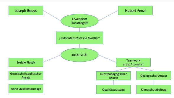 "In jedem steckt ein Künstler", d.h. jeder Mensch kann mit seinen kreativen Fähigkeiten "zum Wohl der Gesellschaft" tätig werden und u.a. mit Baumspenden den Klimawandel bekämpfen, er ist aber bei entsprechender Anleitung auch in der Lage, ein formalästhetisches Kunstwerk zu schaffen.