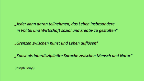 "Jeder Mensch ist ein Künstler", d.h. jeder Mensch kann mit seinen kreativen Fähigkeiten "zum Wohl der Gemeinschaft tätig werden", indem er diese nutzt, um u.a. den Klimawandel zu bekämpfen ("Soziale Plastik").