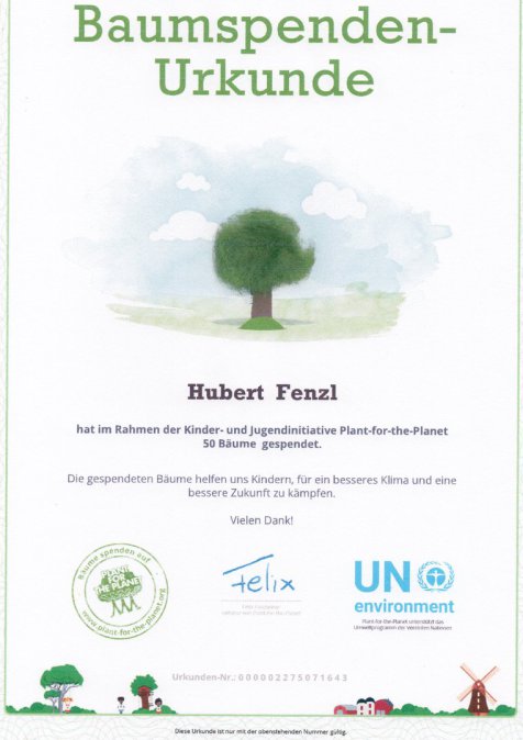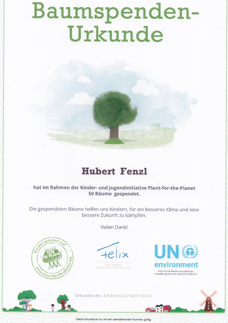 Als Nachweis ist dem Werk eine entsprechende Baumspenden-Urkunde beigefügt bzw. auf der Bildrückseite aufgeklebt.