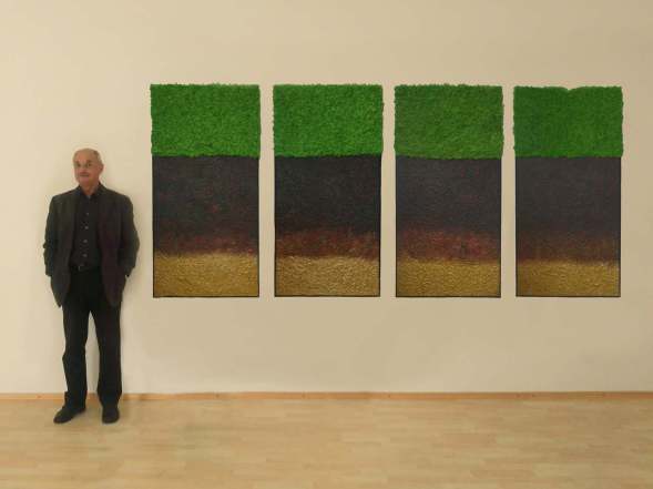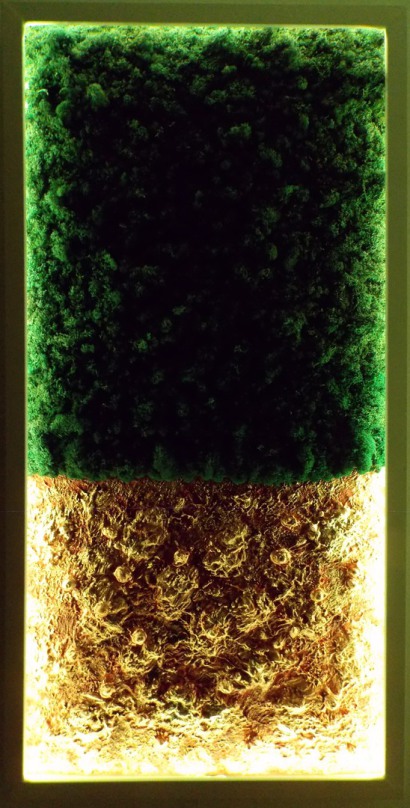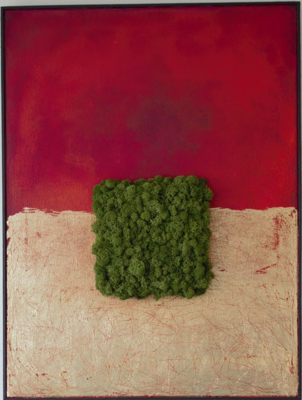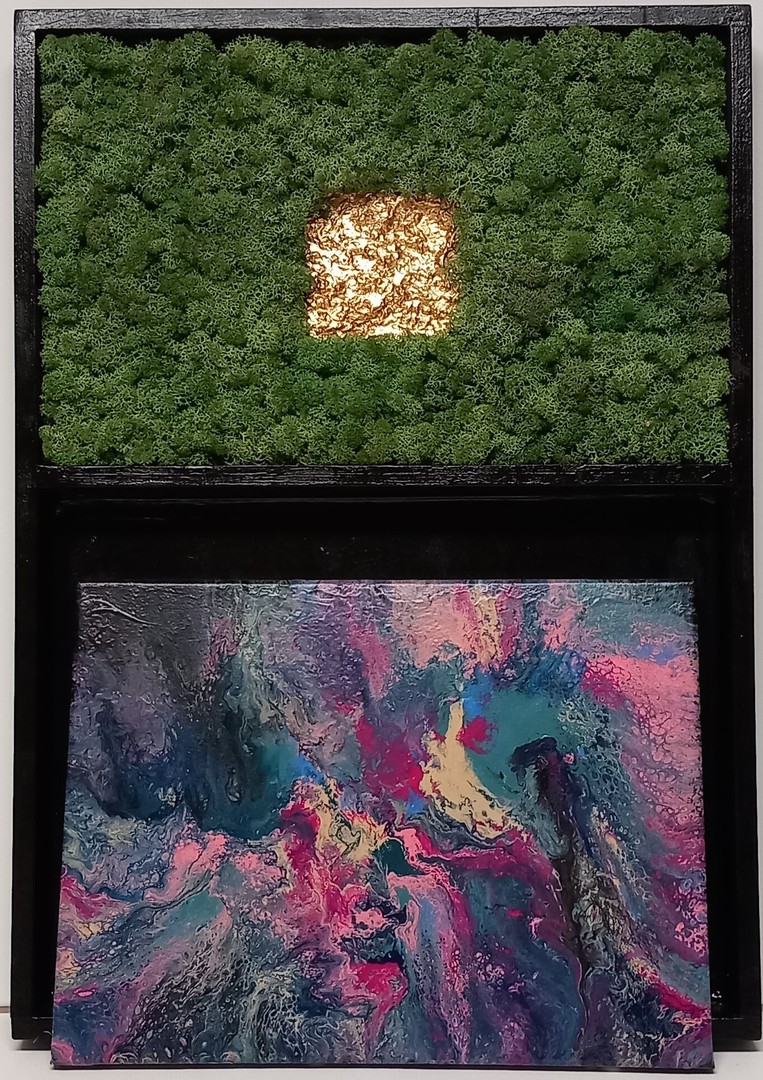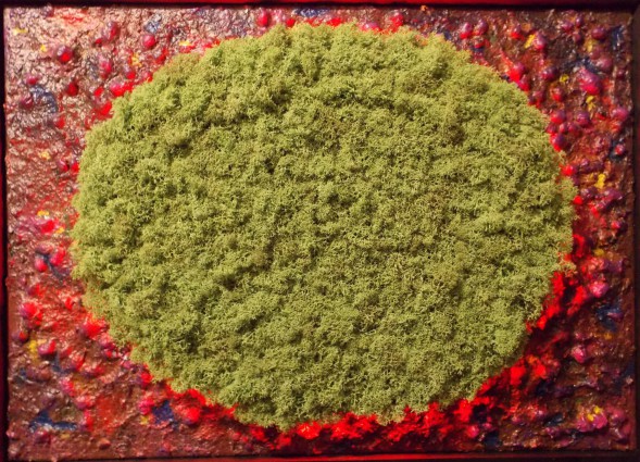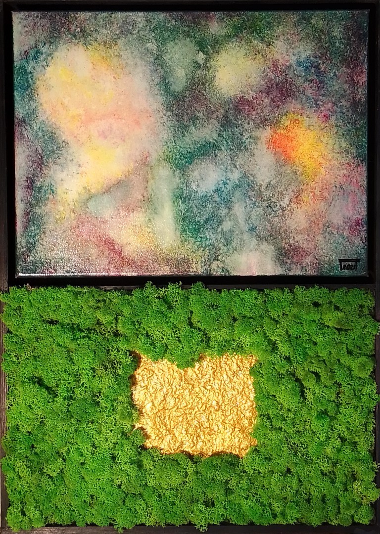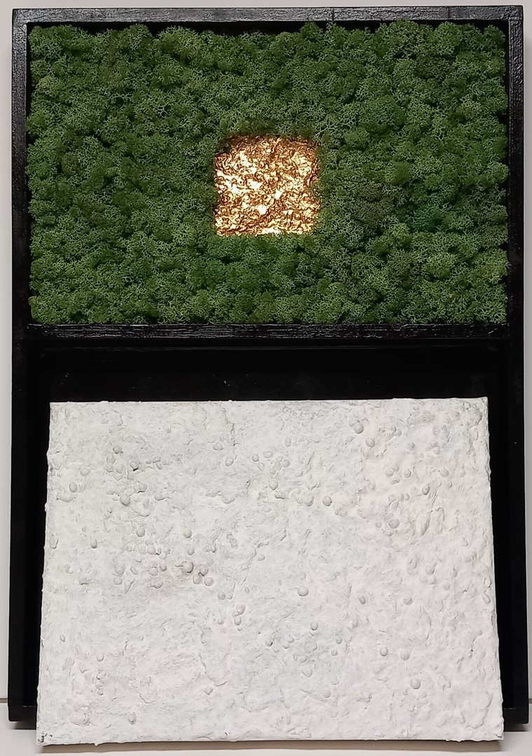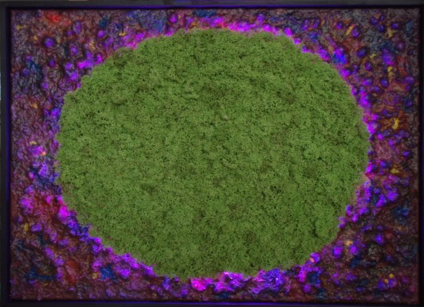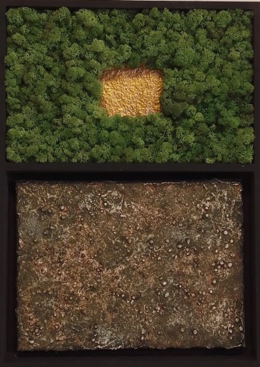 Ein Kunstinteressent erwirbt ein anderes von mir geschaffenes Kunstwerk, beispielsweise eine Assemblage mit integriertem Islandmoos. Ich dürfte vermutlich einer der ersten akademischen Künstler sein, die als Gestaltungsmittel organisches Material einsetzen. Zumindest ist mir kein anderer in dieser Weise arbeitender Künstler bekannt.