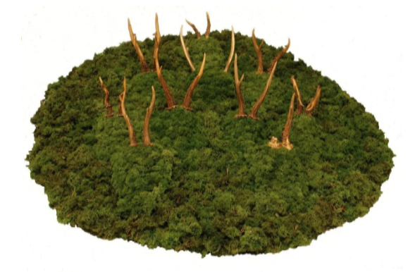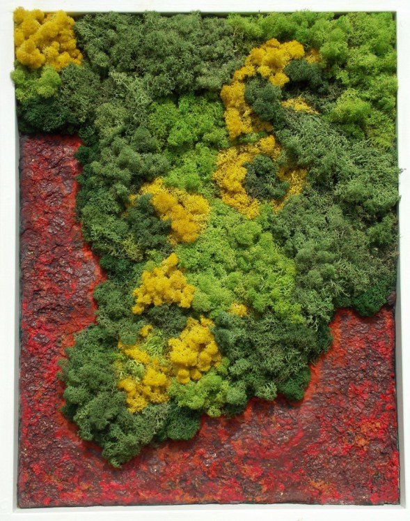Ein Kunstinteressent entwirft mit mir gemeinsam ein aus Islandmoos / Rentierflechte gefertigtes Wandbild, das z.B. Assoziationen zum aus der Vogelperspektive gesehenen Regenwald oder einem Wald in Indian summer- Farben hervorruft. Die von mir gestalteten Moos-Elemente werden dann von mir, vom Käufer selbst oder mit Hilfe eines Schreiners an einer Wandfläche montiert.