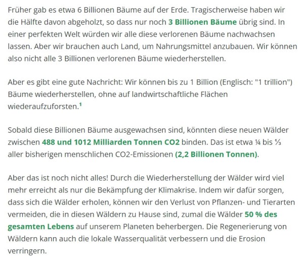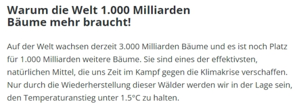 Das Pflanzen von Billionen von Bäumen dürfte nämlich die billigste und effektivste Methode sein, den Klimawandel zu bekämpfen. So schreibt auch der renommierte Wissenschaftsjournalist Franz Alt: