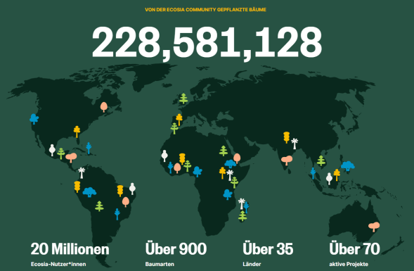 Wenn man bei der Suchmaschine Ecosia auf Werbeanzeigen klickt, erhält Ecosia von den Firmen Geld. So kann etwa alle 45 Suchanfragen ein neues Bäumchen gepflanzt werden, und zwar dort, wo diese am dringendsten benötigt werden - z.B. in Burkina Faso, Madagaskar, Peru, Marokko, Brasilien, Nicaragua, Äthiopien und Tansania. Ende 2021 stand der Zähler bereits bei 121.182.372 Bäumen...