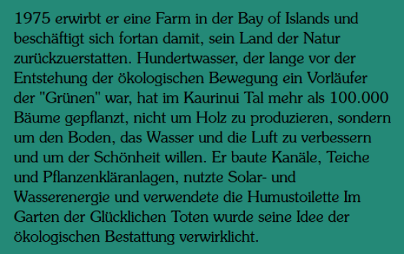 Friedensreich Hundertwasser pflanzte in Neuseeland auf zwei aufgekauften abgeholzten Grundstücken in den 70er Jahren 100 000 Bäume.